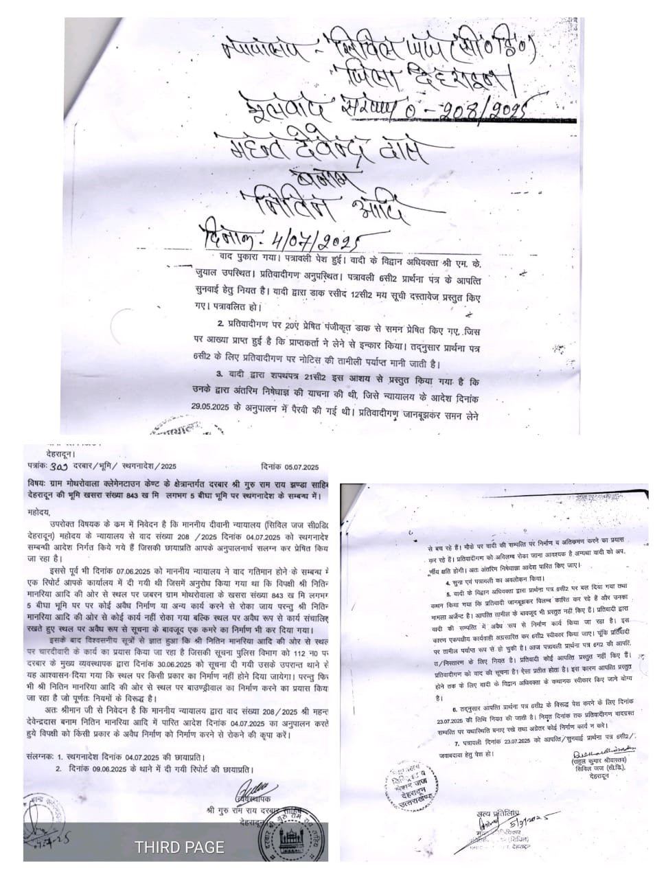 देहरादून, 15 जुलाई। दून में जमीन कब्जाने के मामले रुकने का नाम नहीं ले रहे हैं। ताजा मामला थाना कलेमेनटाउन के क्षेत्रान्तर्गत प्रकाश में आया है। मोथरोवाला क्षेत्र स्थित श्री दरबार साहिब की जमीन पर अवैध कब्जे और निर्माण के प्रयासों को लेकर माननीय सिविल न्यायालय (सीनियर डिविजन) द्वारा सख्त रुख अपनाया गया है। न्यायालय ने दिनांक 4 जुलाई 2025 को विपक्षीगणों के विरुद्ध स्थगन आदेश (निषेधाज्ञा) जारी करते हुए उन्हें किसी भी प्रकार के निर्माण अथवा भूमि के क्रय-विक्रय गतिविधियों से रोक दिया है।